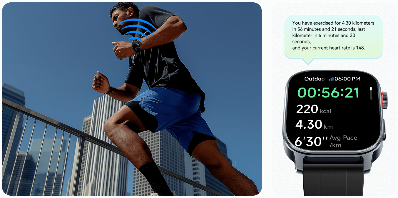 Instantly receive real-time voice updates on your distance,pace,duration,calories burned,and heart rate,allowing you to adjust your performance on the go,enjoy a more rhythmic experience.